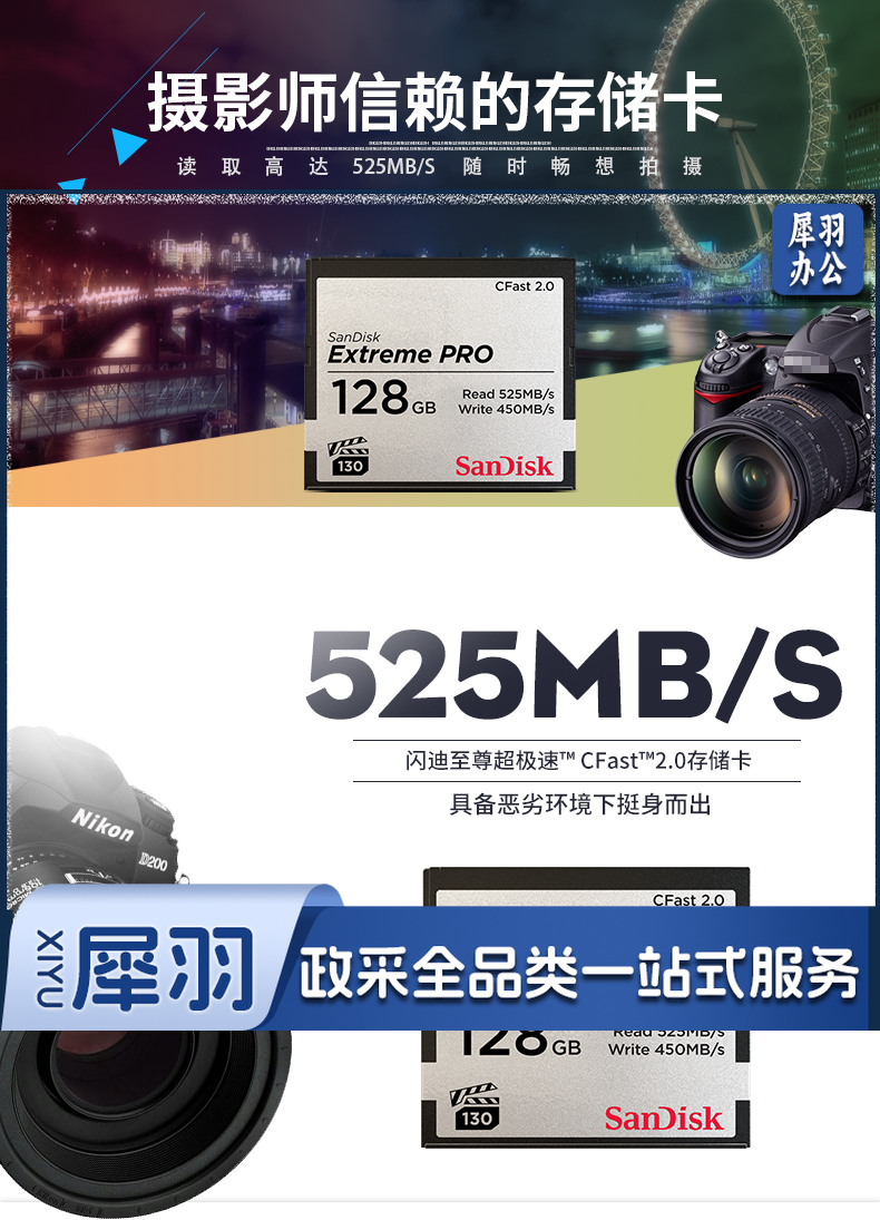 闪迪(SanDisk)128GB CFast 2.0存储卡 VPG-130 4K 至尊超极速版单反相机内存卡 读速525MB/s SDCFSP-128G-Z46D