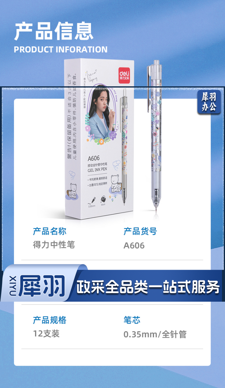得力A606学生中性笔0.35mm按动全针管(黑)(支)
