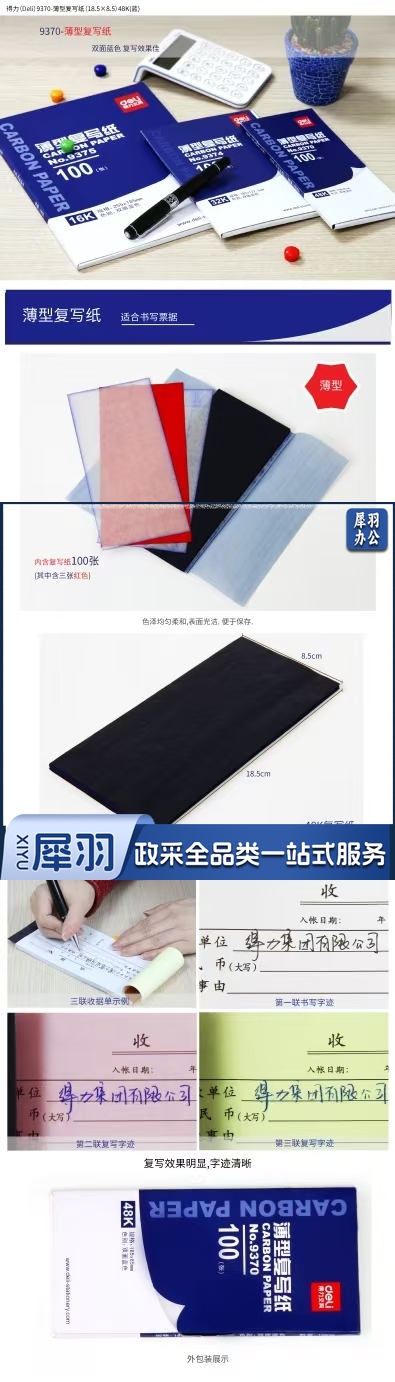 得力9370 复写纸48k 复写纸 收据用复写纸 100张