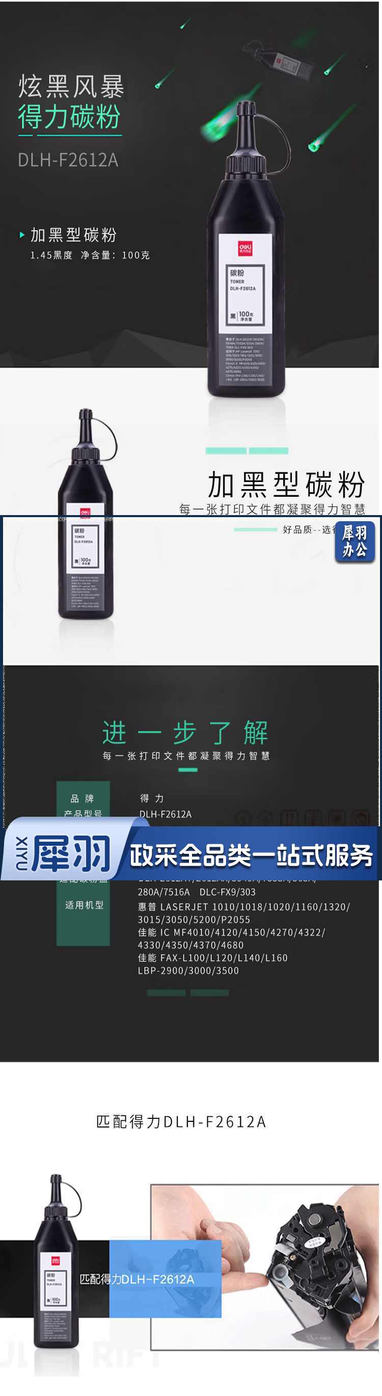 得力(deli) DLH-F2612A 瓶装碳粉/墨粉 (适用惠普1010 1012 1015 1020 3050 M1005 M1319f佳能2900/3000)单拍电联