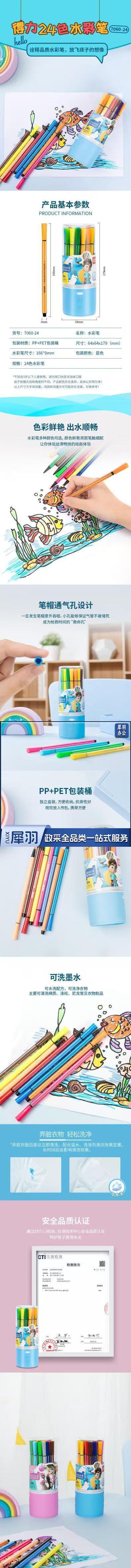 得力7060 细六角杆24色水彩笔 细杆水彩笔套装 涂色画画笔 可洗绘画笔(蓝色1桶)