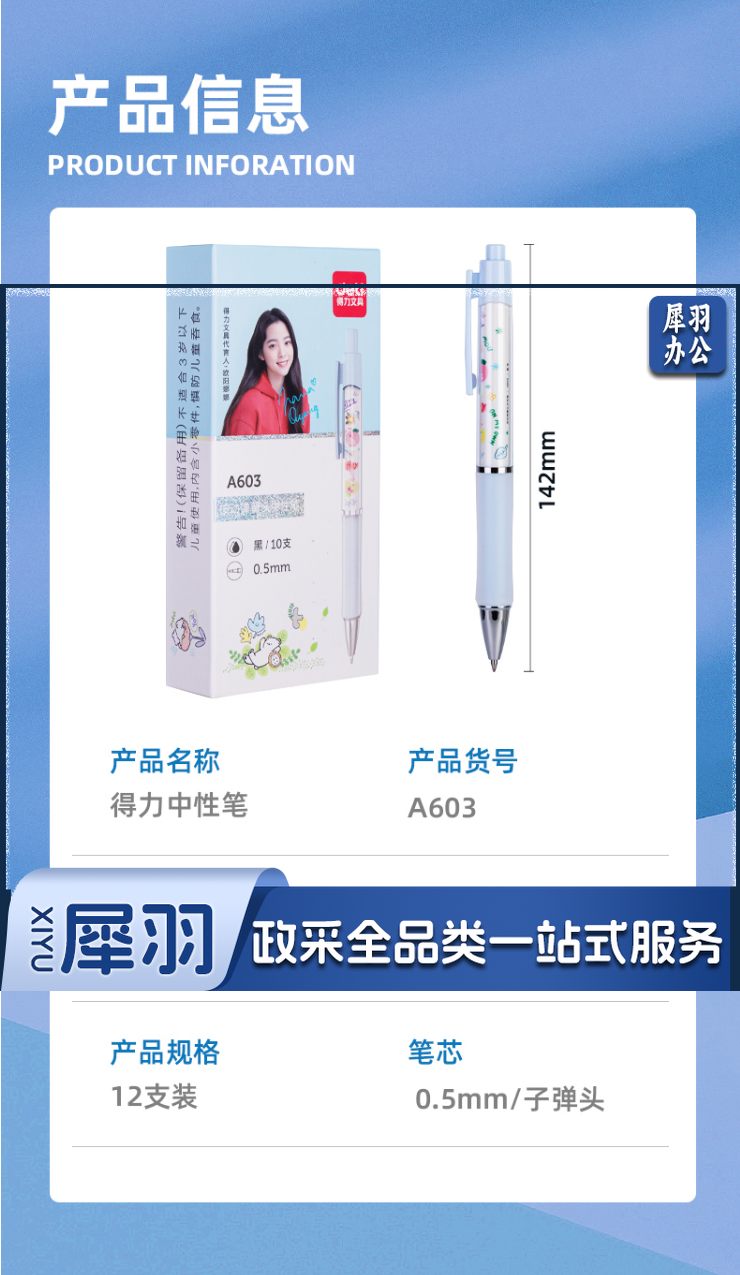 得力A603学生中性笔0.5mm按动子弹头速干(黑)(支)