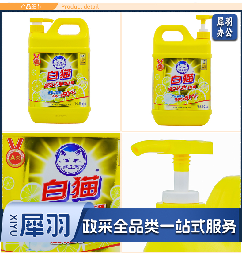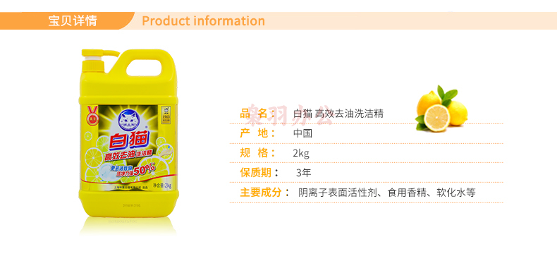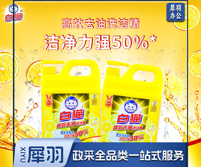 白猫 柠檬味2KG 高效去油洗洁精2kg A类食品用含更多去油因子轻松去油易冲洗 洗洁精 洗涤灵 洗洁剂