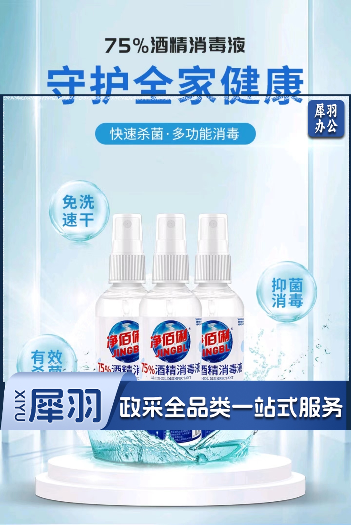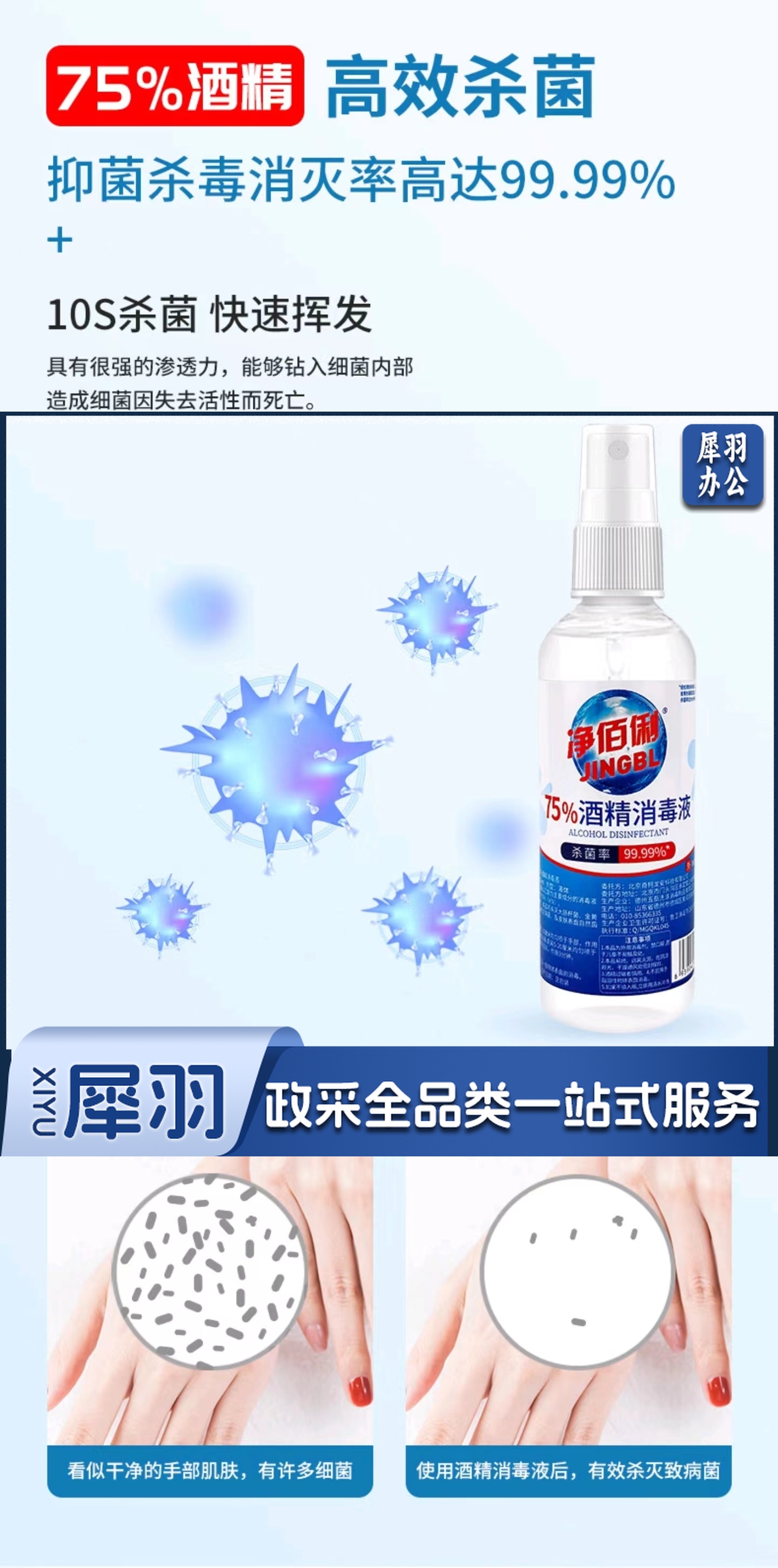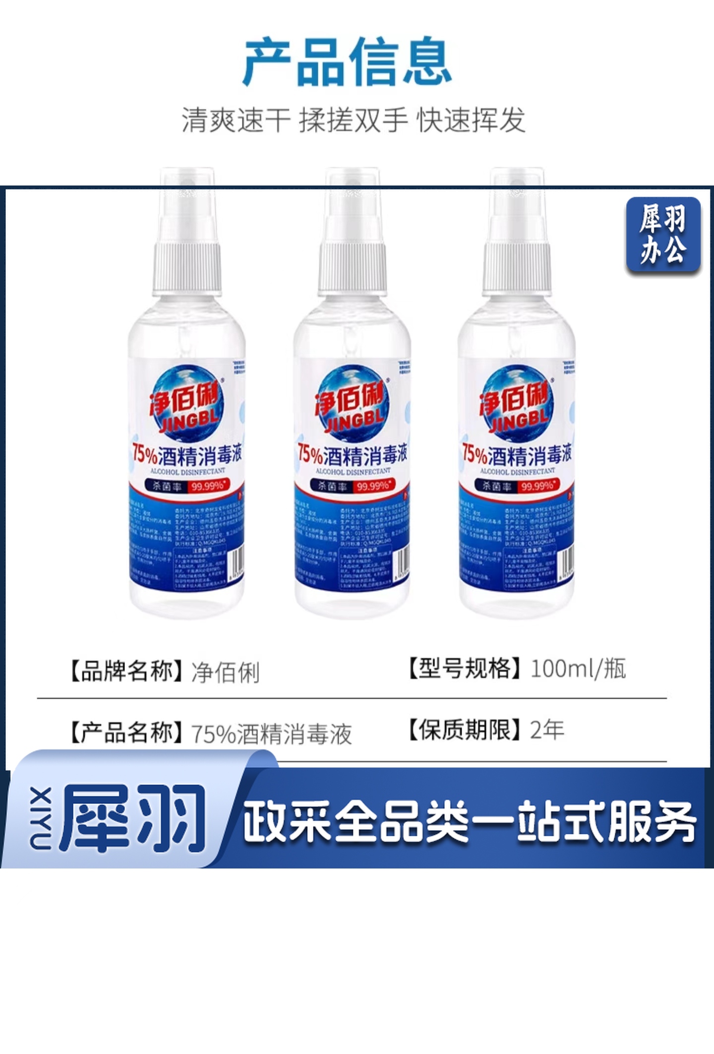 净佰俐75%酒精消毒液 100ml*160瓶整箱装 酒精喷雾液体 免洗手乙醇