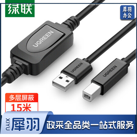 绿联(UGREEN)10362 高速USB打印机数据线 2.0方口连接线AM/BM 适用佳能爱普生惠普打印机 带信号放大器15米