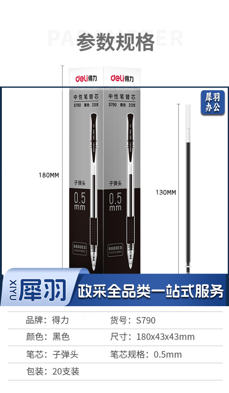 得力S790中性笔替芯0.5mm子弹头(黑)