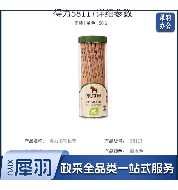 得力58117-HB原木书写铅笔(原木色)(50支/筒)