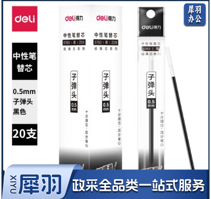 得力S760子弹头中性笔芯0.5mm子弹头(黑) 20支/盒 单位:盒