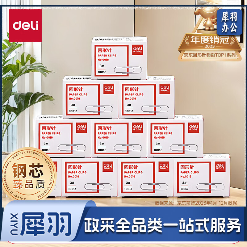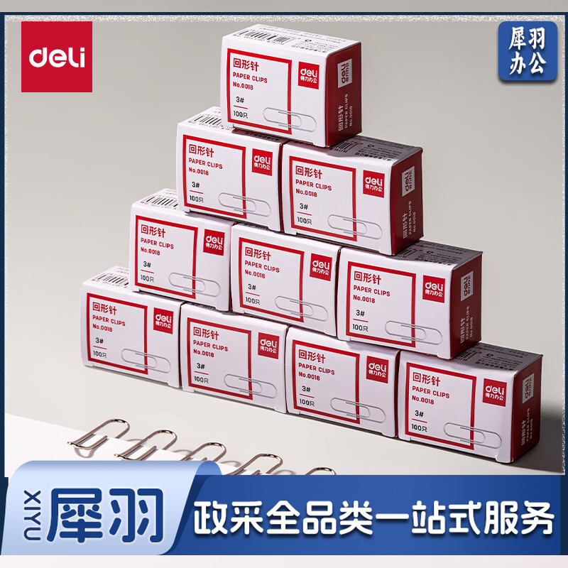 得力(deli)3#金属回形针 镀镍防锈曲别针 100枚/盒 10盒装 办公室具用品 P00018