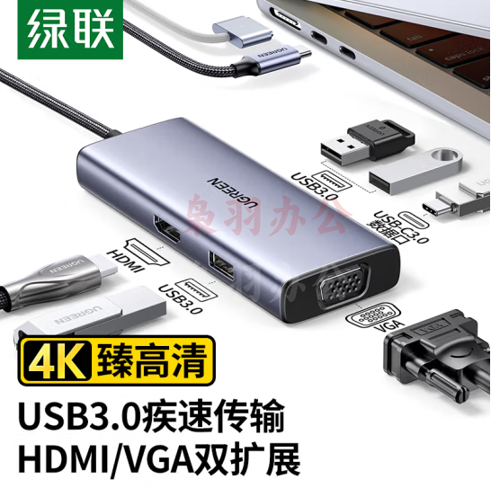 绿联90883 Type-C扩展坞拓展坞USB3.0分线器集线器HDMI/VGA/HUB转换器4K高清投屏通用C口苹果华为联想笔记本电脑