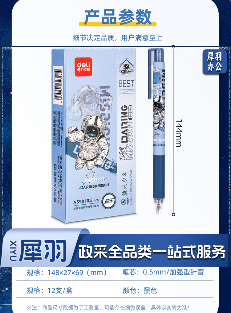 得力A590中国航天速干按动学生中性笔0.5mm加强型针管(黑)(支)