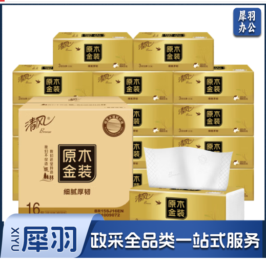 清风抽纸BR15SJ16E面巾纸 原木金装 3层130抽*16包/箱
