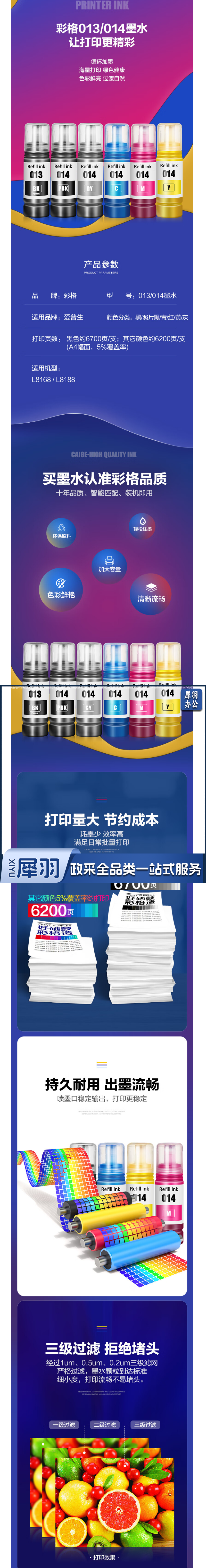 彩格013/014墨水六色套装 适用爱普生打印机Epson L8168 L8188墨水(013BK/014PB/014C/014M/014Y/014GY)