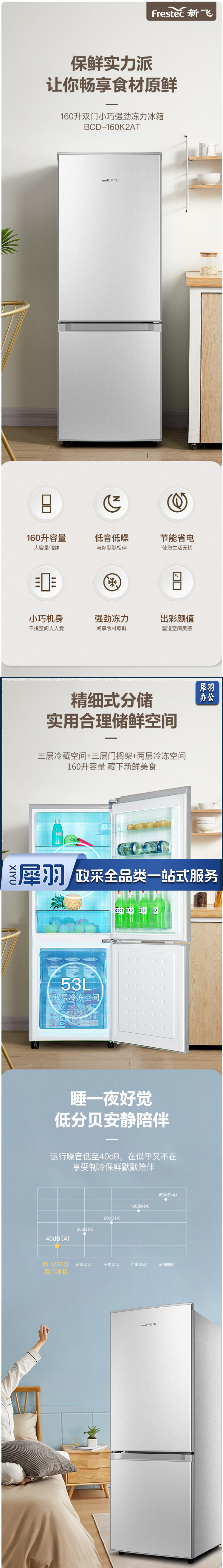 新飞(Frestec)160升两门冰箱双门小冰箱环保内胆家用小型双门冰箱宿舍租房小巧不占地方BCD-160K2AT