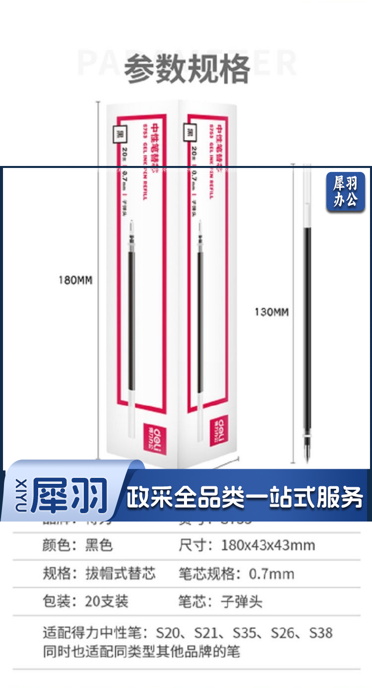得力S753子弹头中性笔芯0.7mm子弹头(黑)(支)