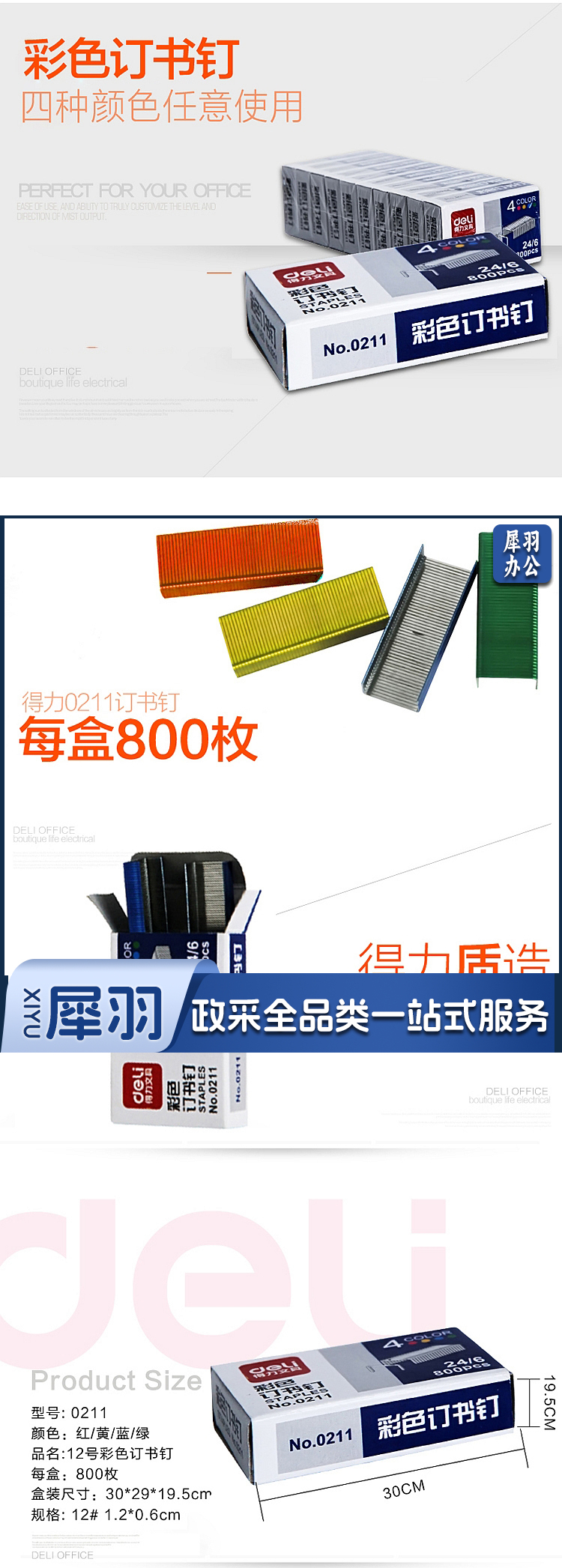 得力0211彩色订书钉12# 24/6 800枚/盒 (单位:盒) 混色(可当天配送发货)