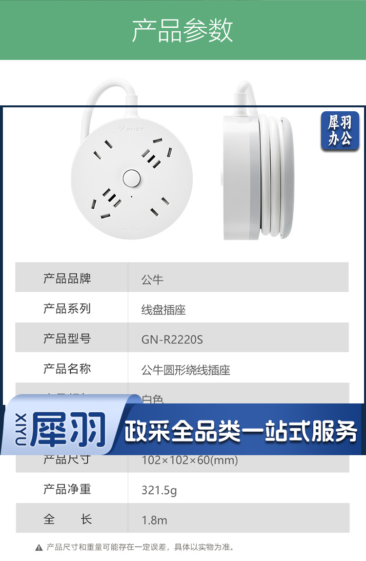 公牛(BULL)GN-R2220S可收纳绕线插座/插线板/插排/排插/拖线板 圆形插座4位总控 全长1.8米