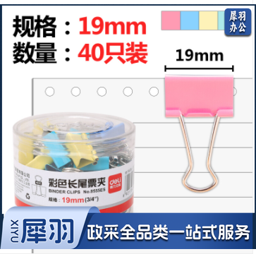 得力8555-5#彩色长尾票夹19mm(筒装)(40只/筒)(10筒起售,偏远区域下单请电话咨询)