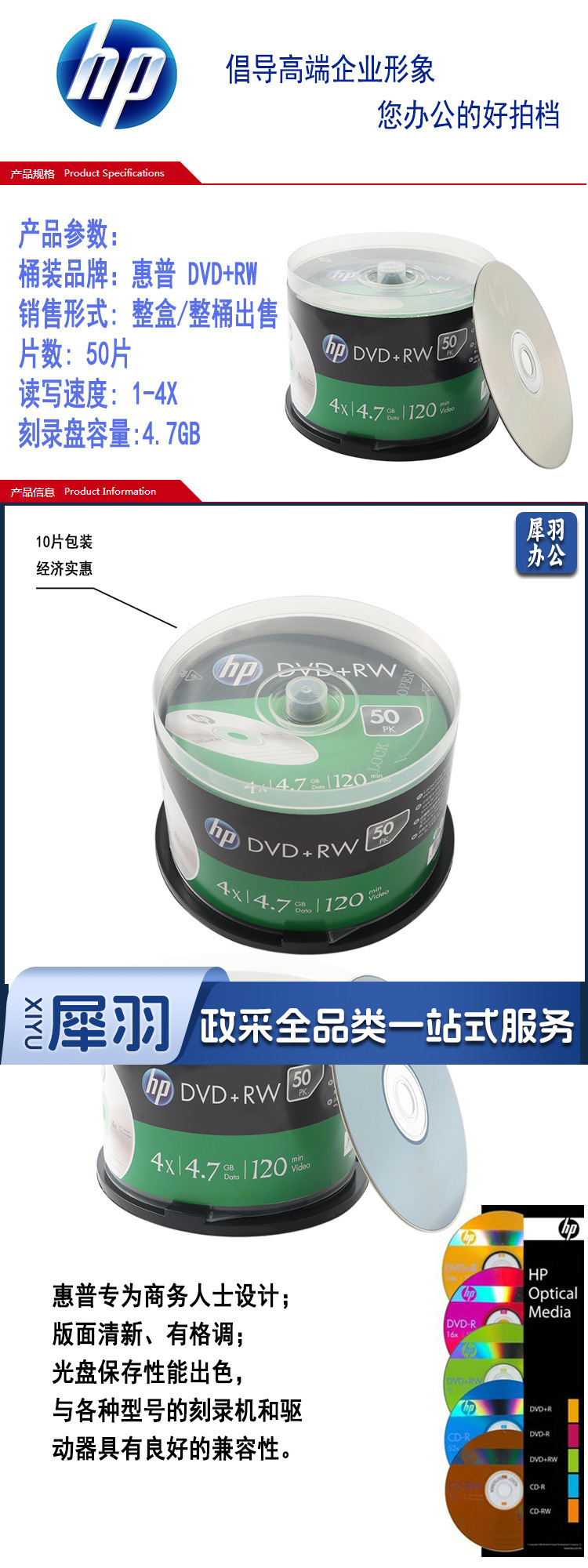 HP DVD+RW 可擦写空白刻录 光盘光碟 可重复刻录 50片装 4.7g