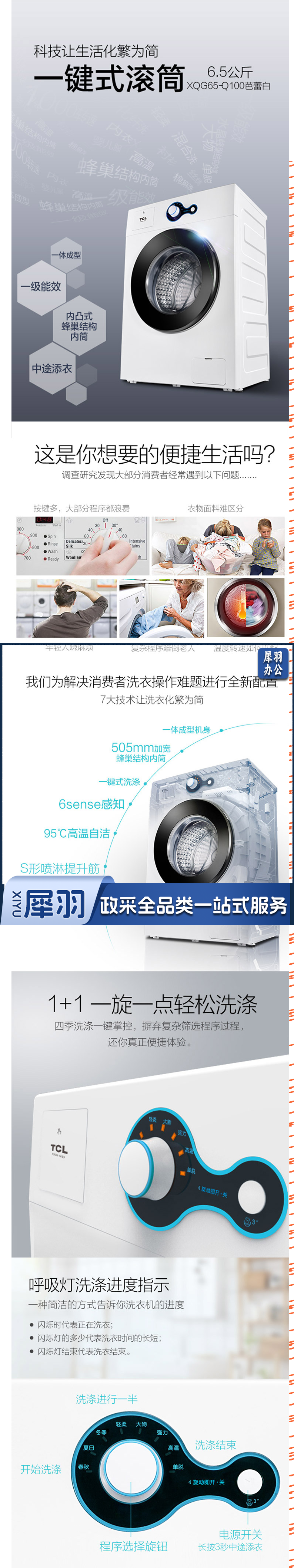 TCL XQG65-Q100 6.5公斤 滚筒洗衣机 一键便捷 中途添衣(芭蕾白)