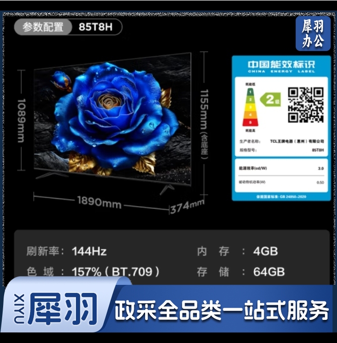 TCL电视 85T8H 85英寸 百级分区 QLED量子点 超薄 2.1声道音响 144Hz 客厅液晶智能平板游戏电视机