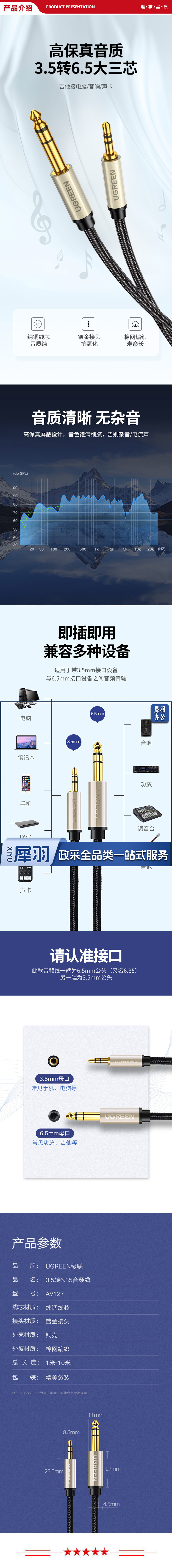 绿联 UGREEN 40806 3.5mm转6.5mm公对公音频线 AV127 6.35功放调音台转换线 5米