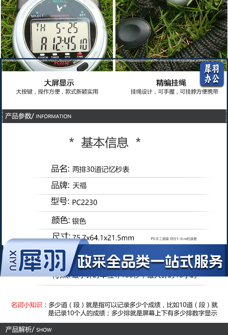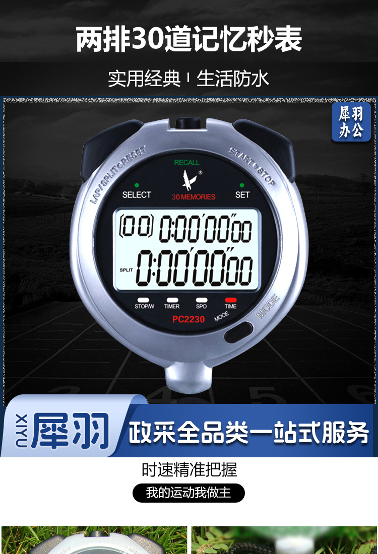 天福专业多功能秒表计时器闹钟田径比赛 户外运动跑步训练游泳电子记忆计时秒表双排30道PC2230