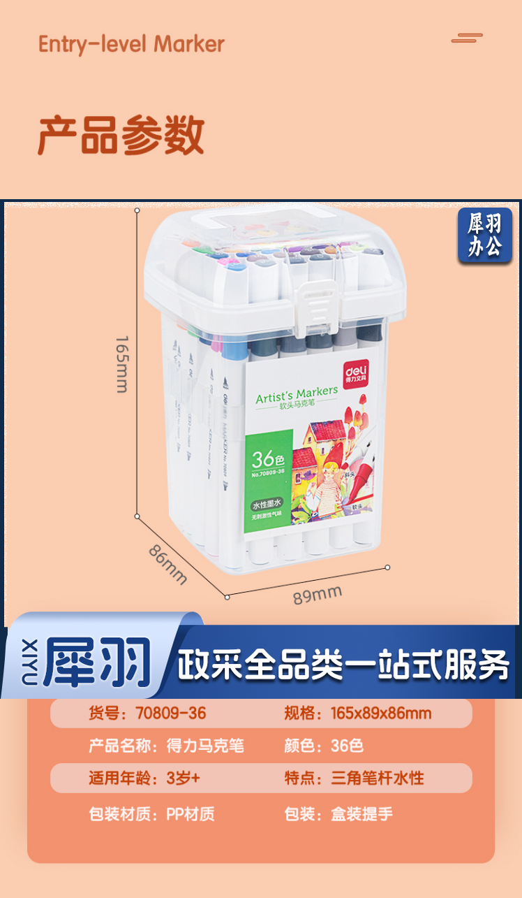 得力70809-36色细三角杆水性软头马克笔(混)(36色/桶)
