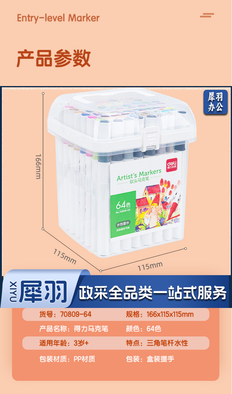 得力70809-64色细三角杆水性软头马克笔(混)(64色/桶)