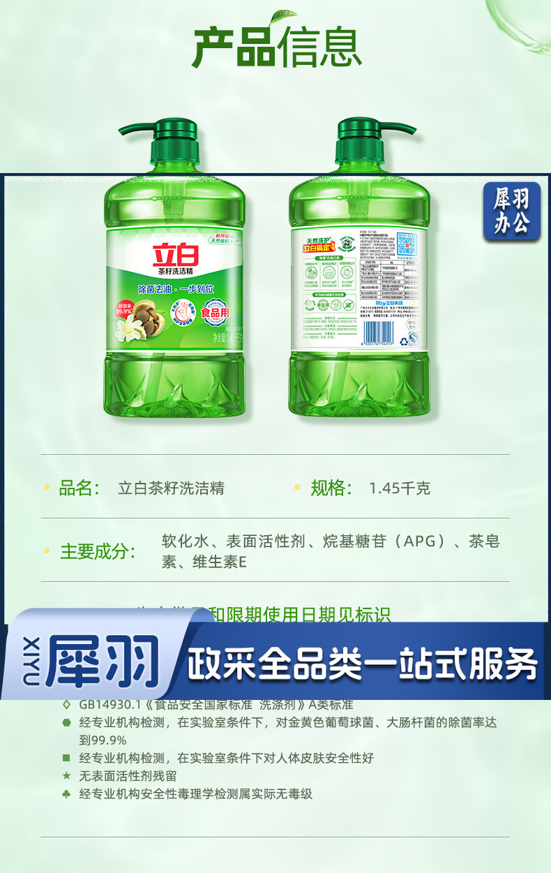 立白茶籽洗洁精1.45kg99%除菌高效去油除味宝宝餐具果蔬适用家庭装