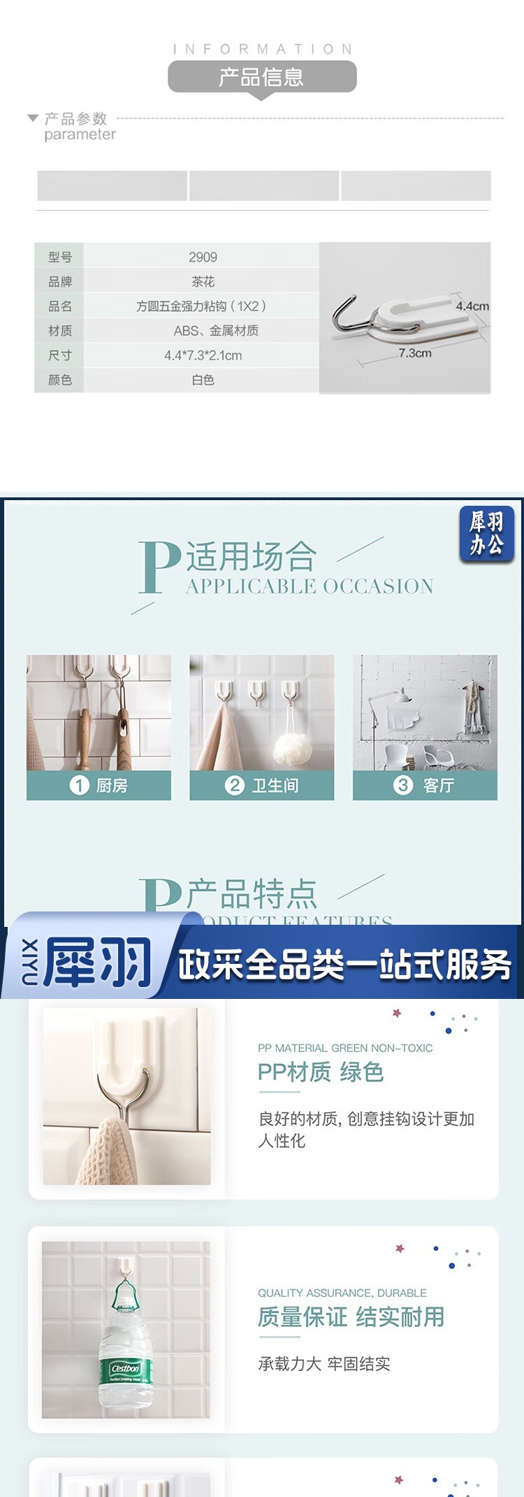 茶花(CHAHUA)2909方圆五金强力粘勾(1*2)4.4*7.3*2.1 (单位:组)