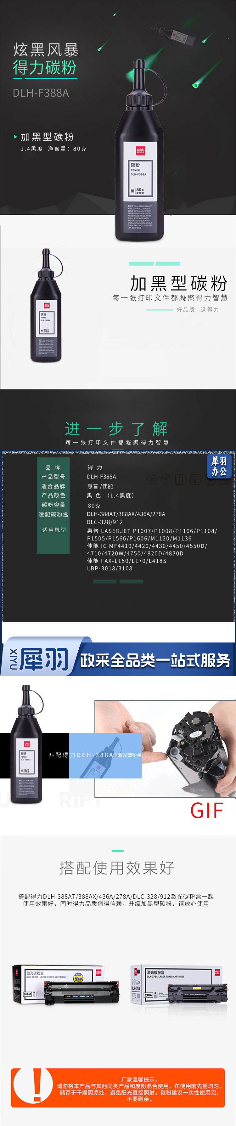 得力388A碳粉 388A墨粉 CC388A黑色墨粉(瓶) DLH-F388A 适用硒鼓型号:388A/436A/278A/328T/912T/337T