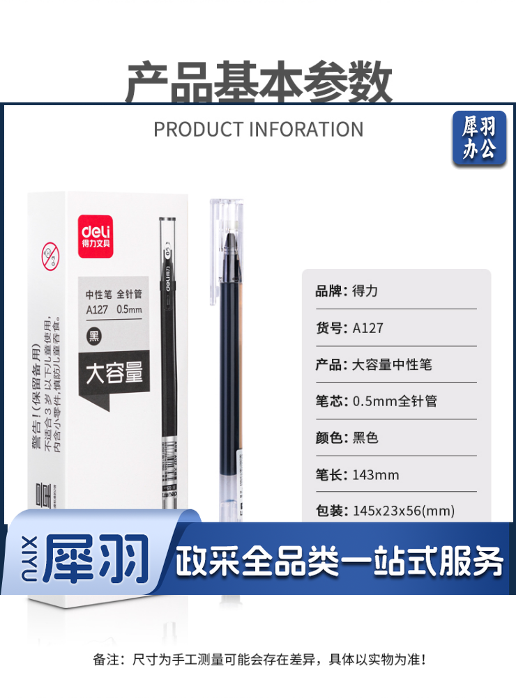 得力A127大容量学生中性笔0.5mm全针管(黑)(支)
