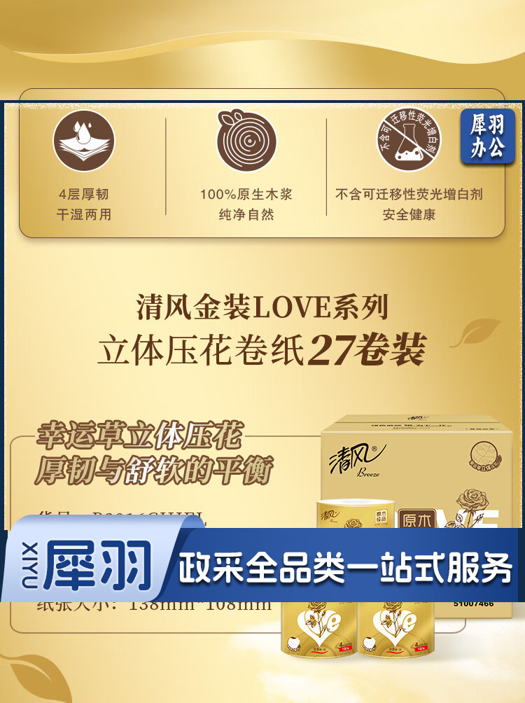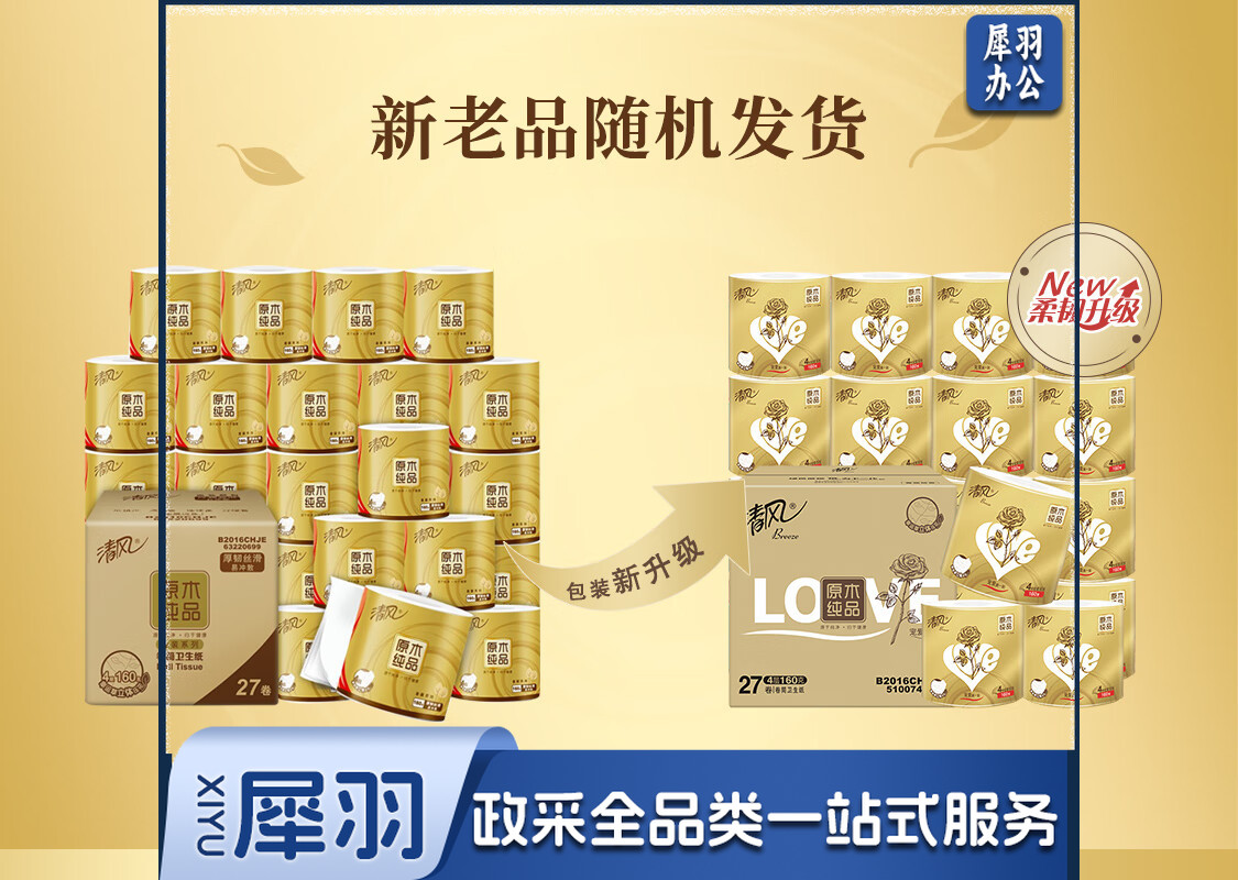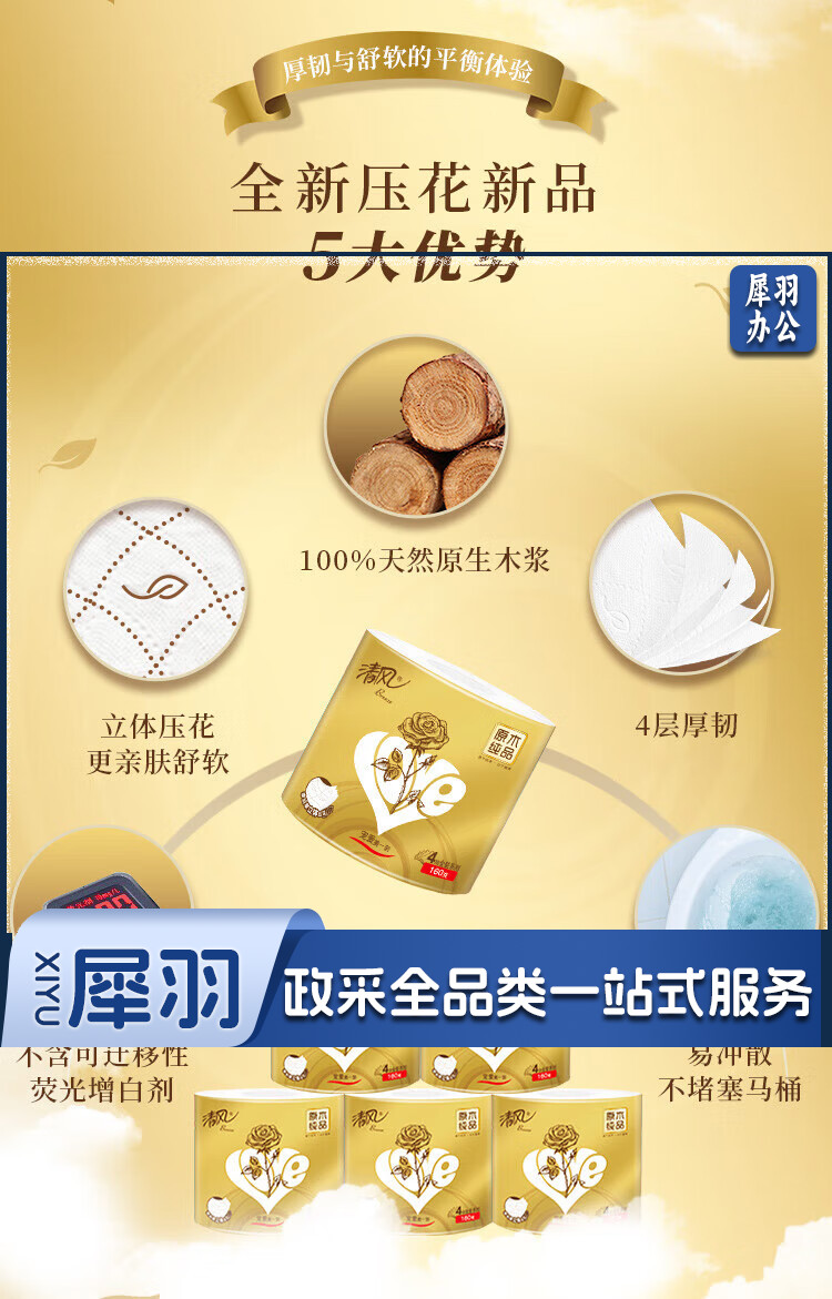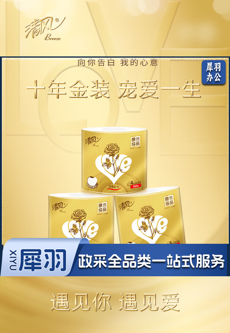 清风卷纸 卫生纸 金装love卷纸4层160g*27卷 整箱销售4层加厚
