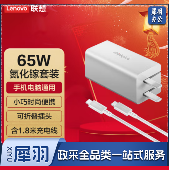 联想thinkplus 口红电源65W氮化镓充电器 折叠插脚 笔记本电脑手机平板电源适配器4239 黑