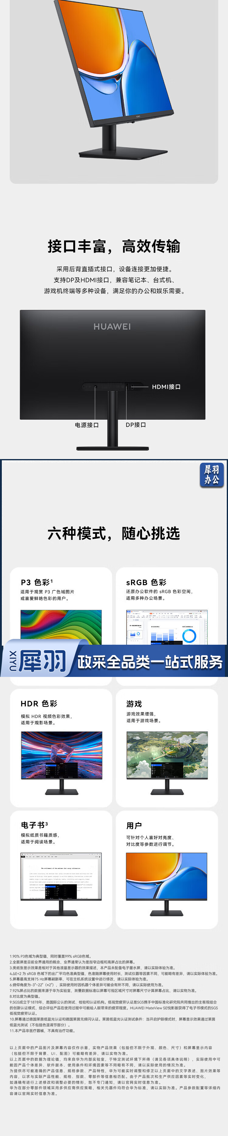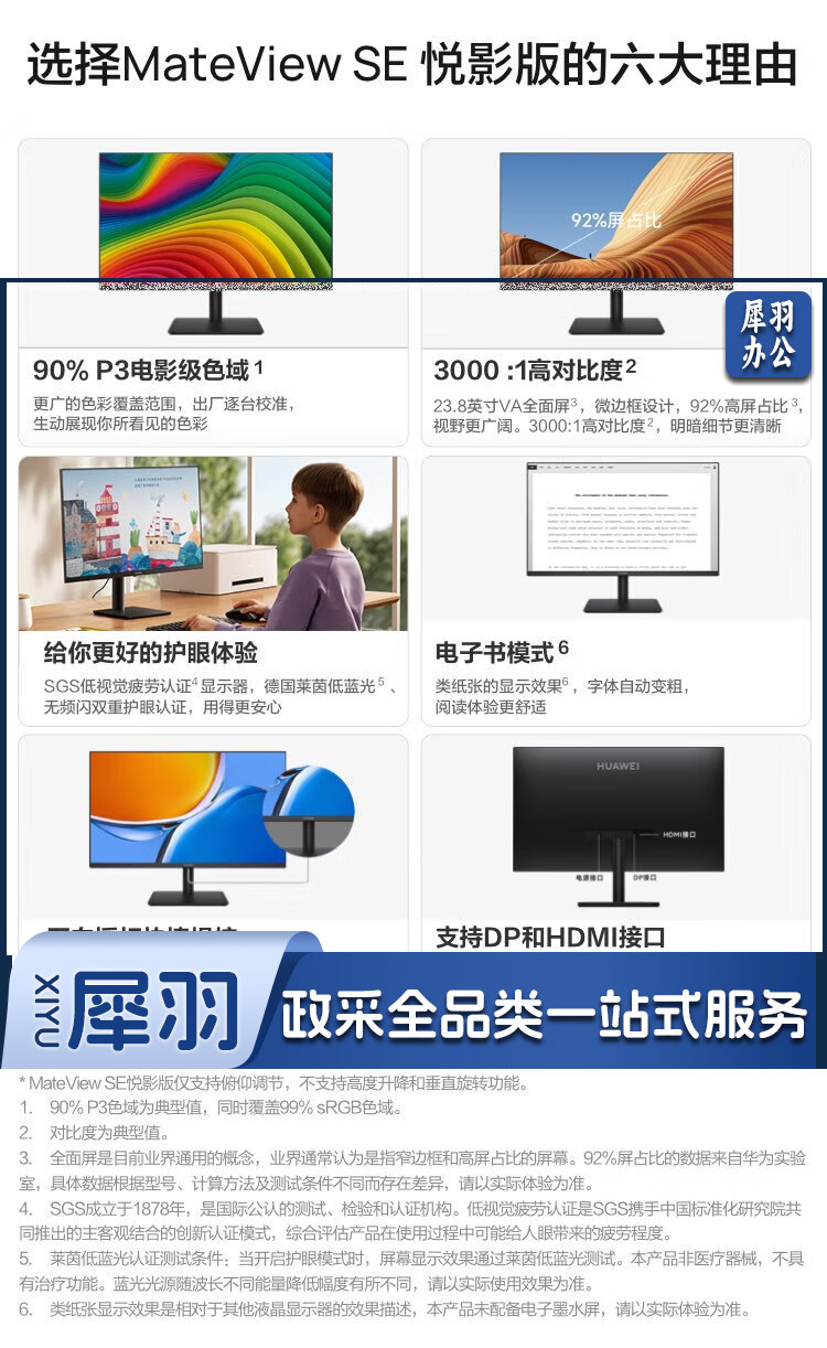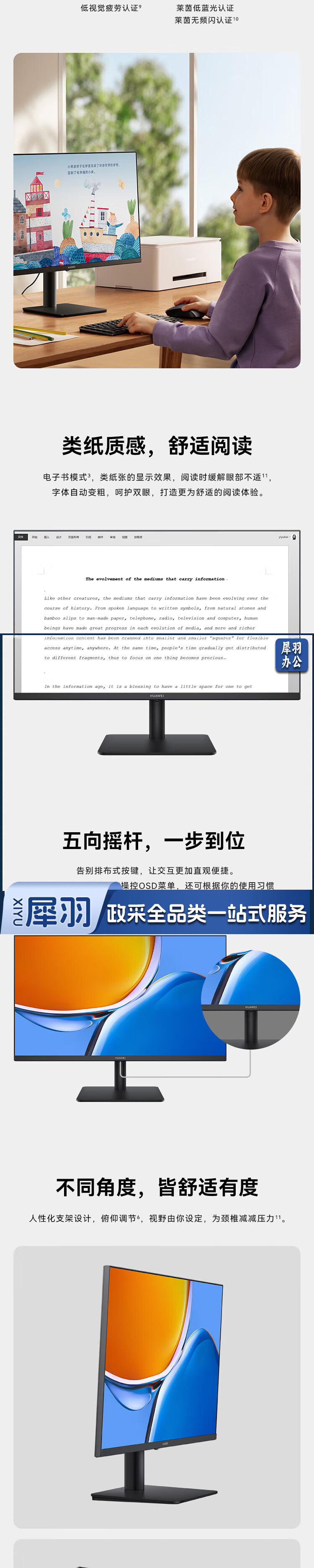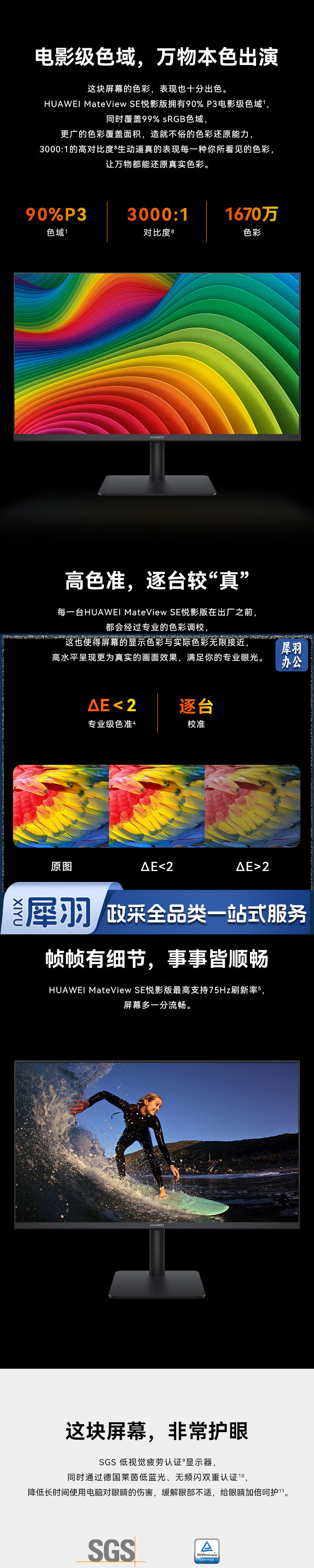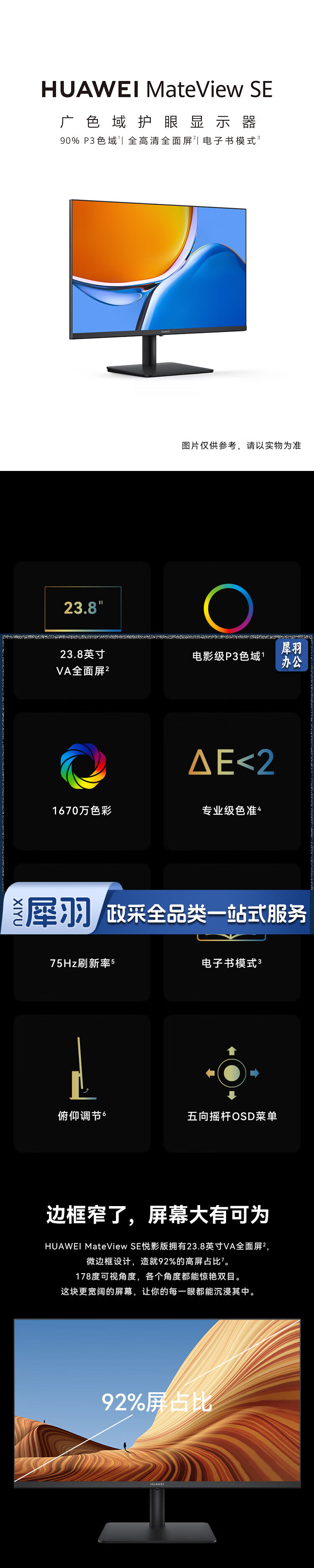 华为MateViewSE悦影版显示器23.8英寸VA全面屏90%P3广色域低蓝光无频闪电子书模式电脑办公(单位:台)