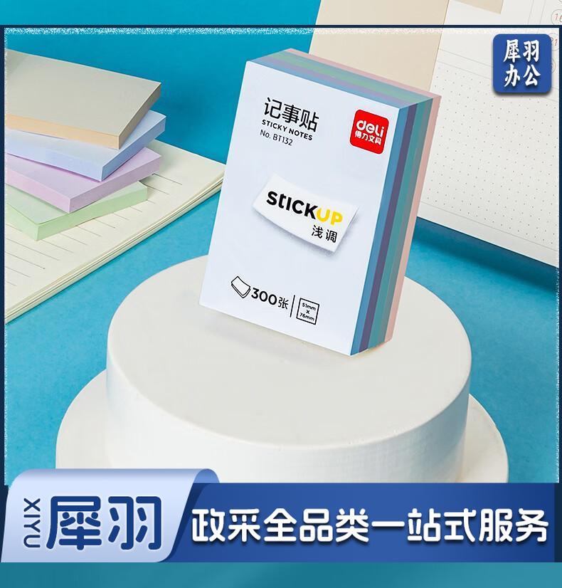 得力(deli)300张4色浅调系列淡彩简约便利贴 76*51mm便签本/记事贴/ 自粘留言本 办公用品 BT132超高性价比彩色300张小号
