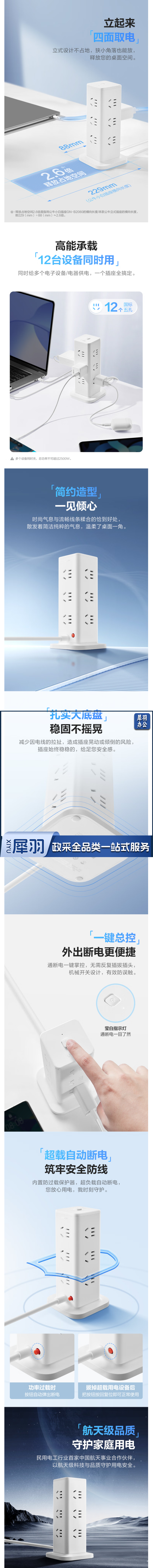 公牛 立式插座 过载保护插排 插线板 接线板 排插 12位总控 全长1.6米 GNV-UL1012U 白色