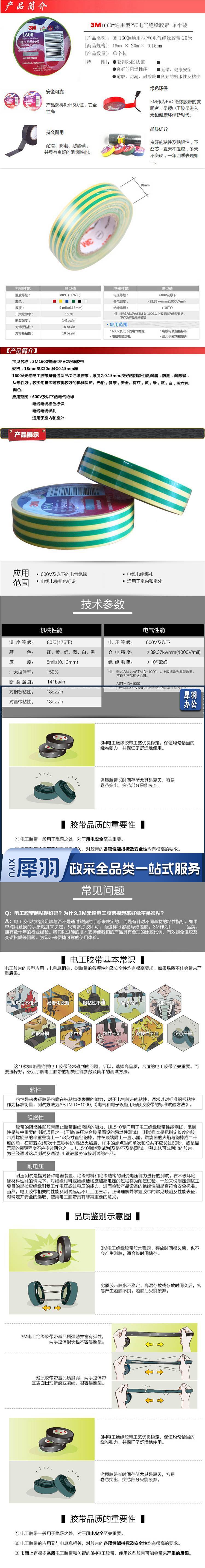 3M 1600# 黄绿 18mm×20m低压电气绝缘胶带(卷)10卷起订