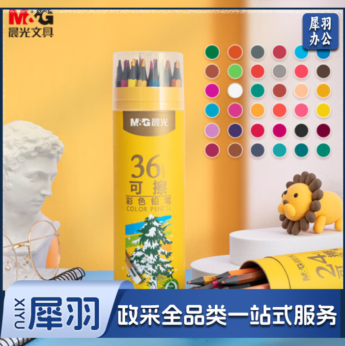 晨光文具36色无木环保彩色铅笔 可擦彩铅 学生美术绘画填色 六角杆黄筒装AWPQ0509开学礼物