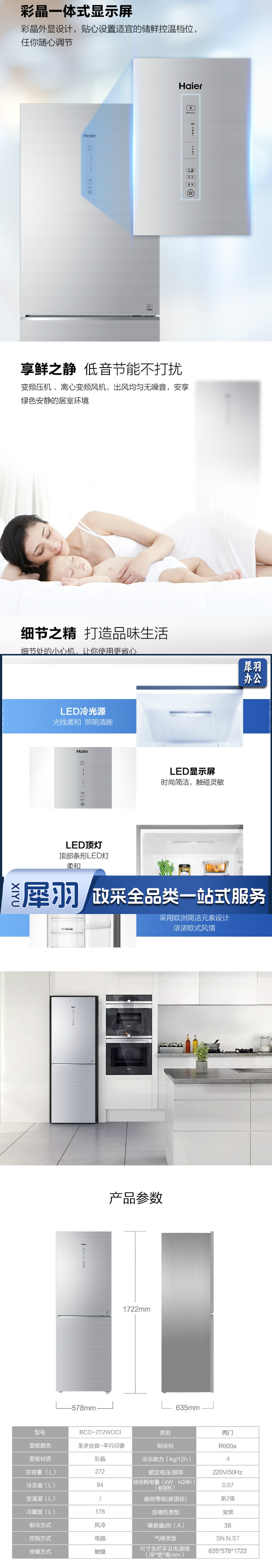 海尔 272升双门冰箱 高配双变频两门风冷无霜 彩晶一体式显示屏 电脑控温BCD-272WDCI