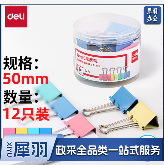 得力(deli)12只50mm彩色长尾夹票夹 1# 12只/筒 8551