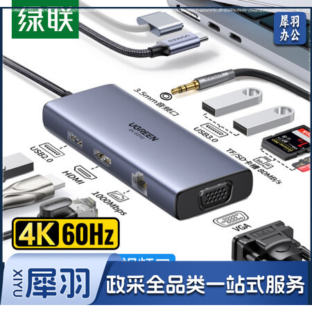 绿联50611 Type-C扩展坞 USB-C转HDMI拓展坞4K千兆网卡口网线转接头分线器适用苹果华为笔记本电脑读卡转换器九合一