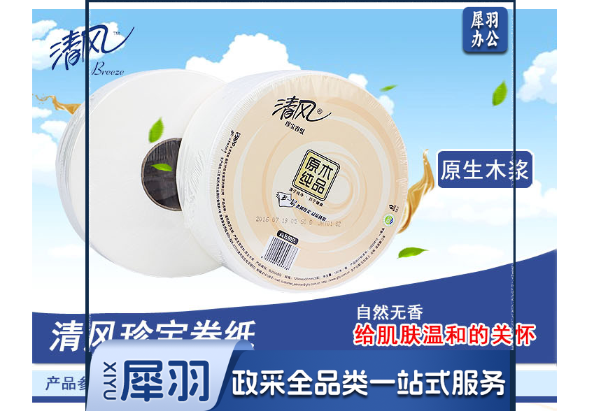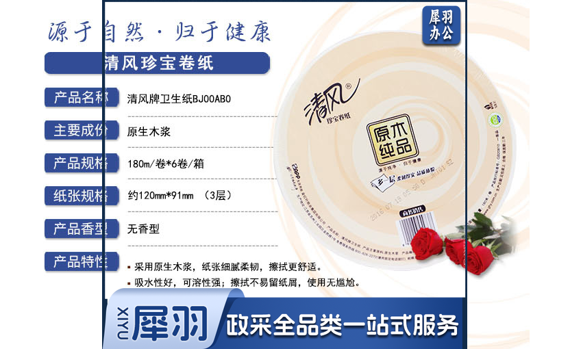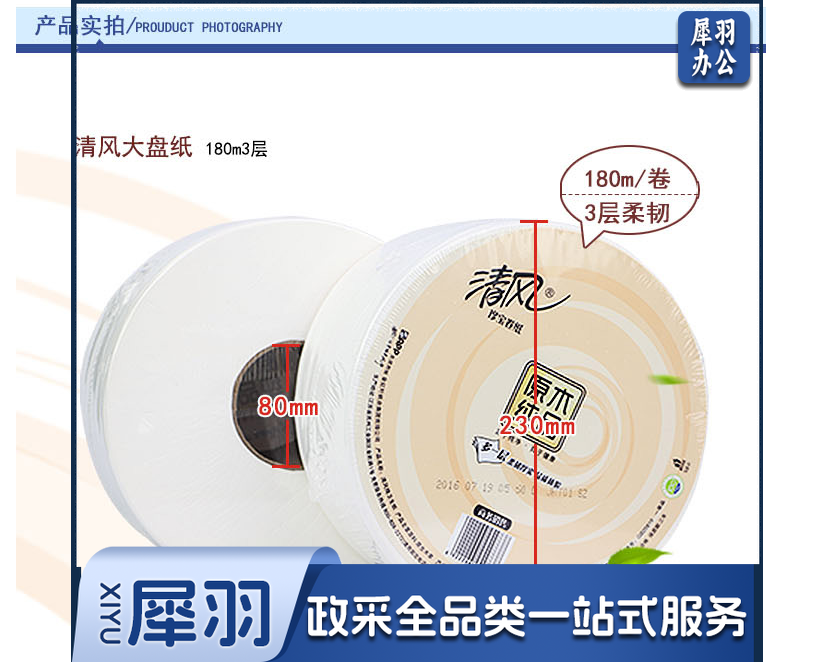 清风大卷纸3层180米*6卷商务大盘纸三层卫生纸厕所用纸手纸巾BJ00ABO