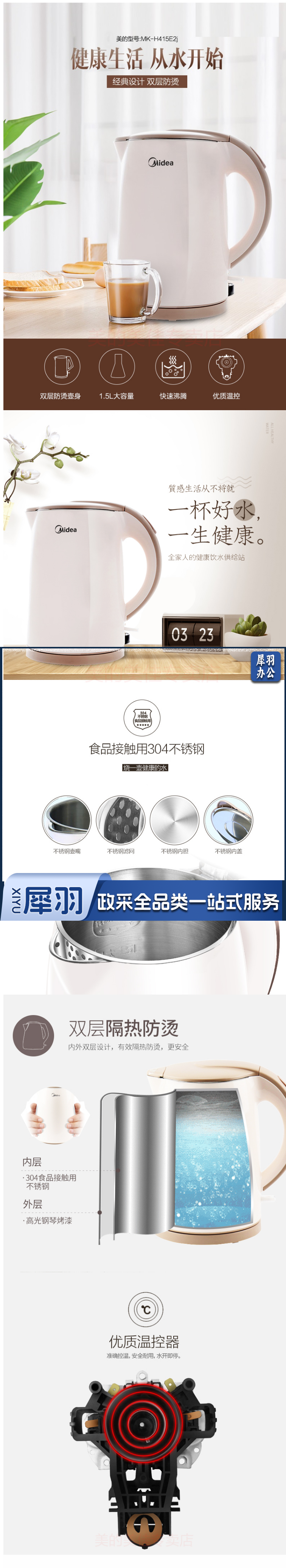 美的(Midea)电水壶 304不锈钢电热水壶 1.5L浅粉色 H415E2J