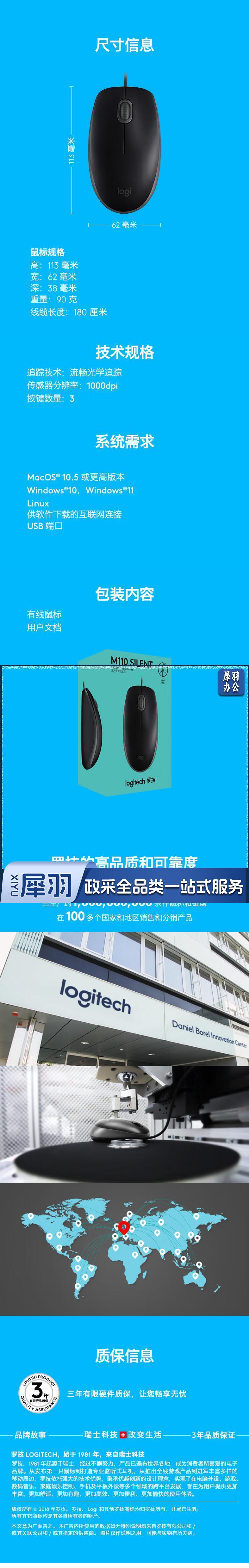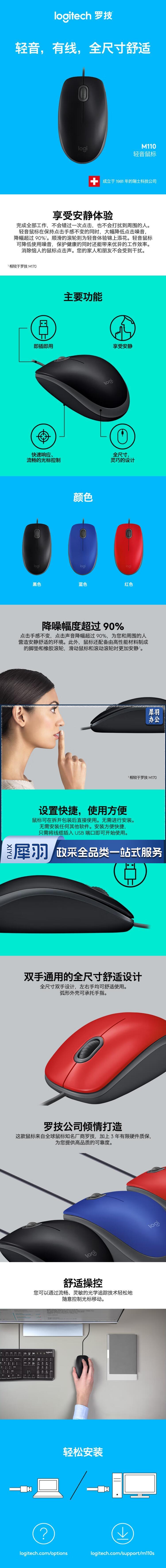 罗技( Logitech) M110 有线静音鼠标 黑色