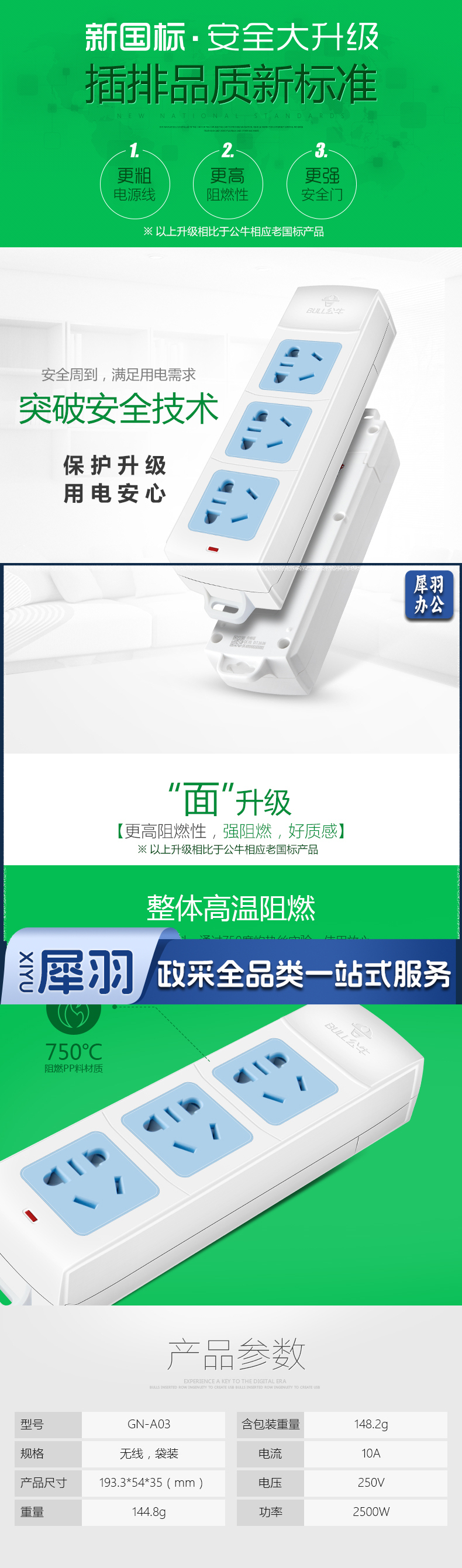 公牛(BULL) GN-A03 不带电源线 无线 多位插座 10A250V