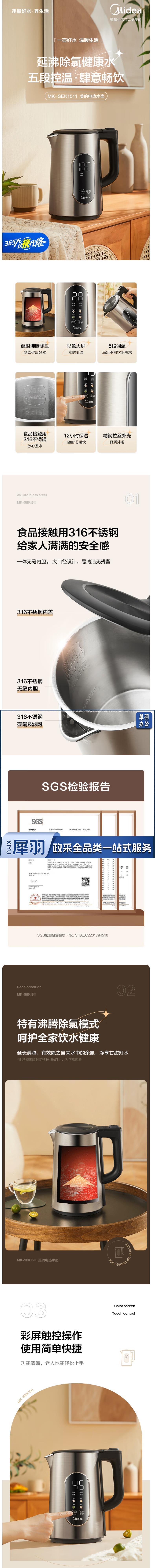 美的(Midea)电热水壶烧水壶保温热水壶1.5L大屏温显5段控温沸腾除氯316不锈钢 MK-SEK1511 货号:JC