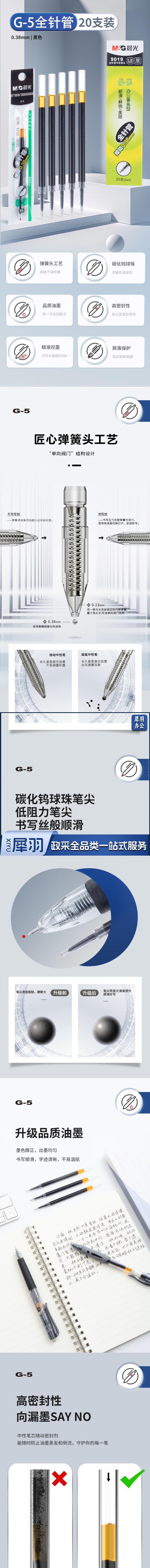 晨光 0.38mm黑色中性笔替芯 经典按动款签字笔替芯 G-5全针管系列水笔芯 20支/盒9019A