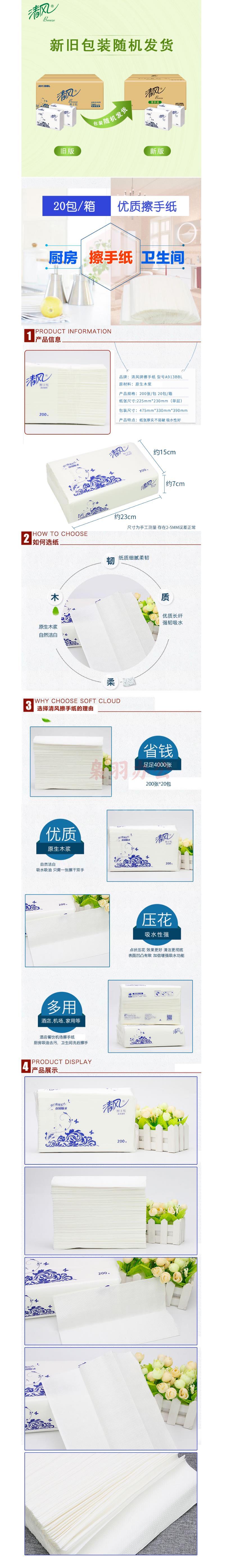 清风 擦手纸200抽20包3折抽 干手纸巾 A913BBL 货号:JC